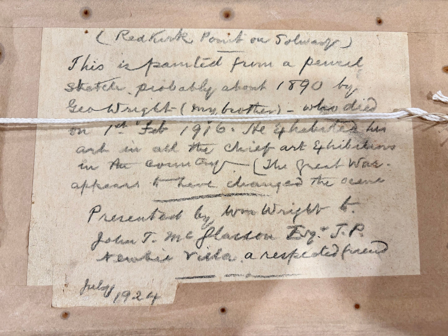Redkirk Point on the Solway Firth located in Dumfries & Galloway. Details on the back of the painting are written by the artist’s sibling and makes mention of The Great War and art exhibitions the pieces were included in.