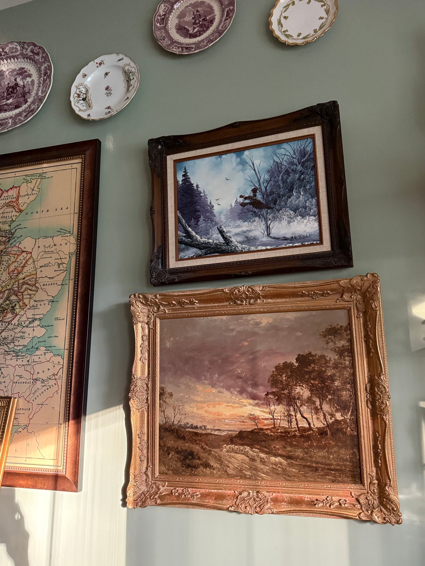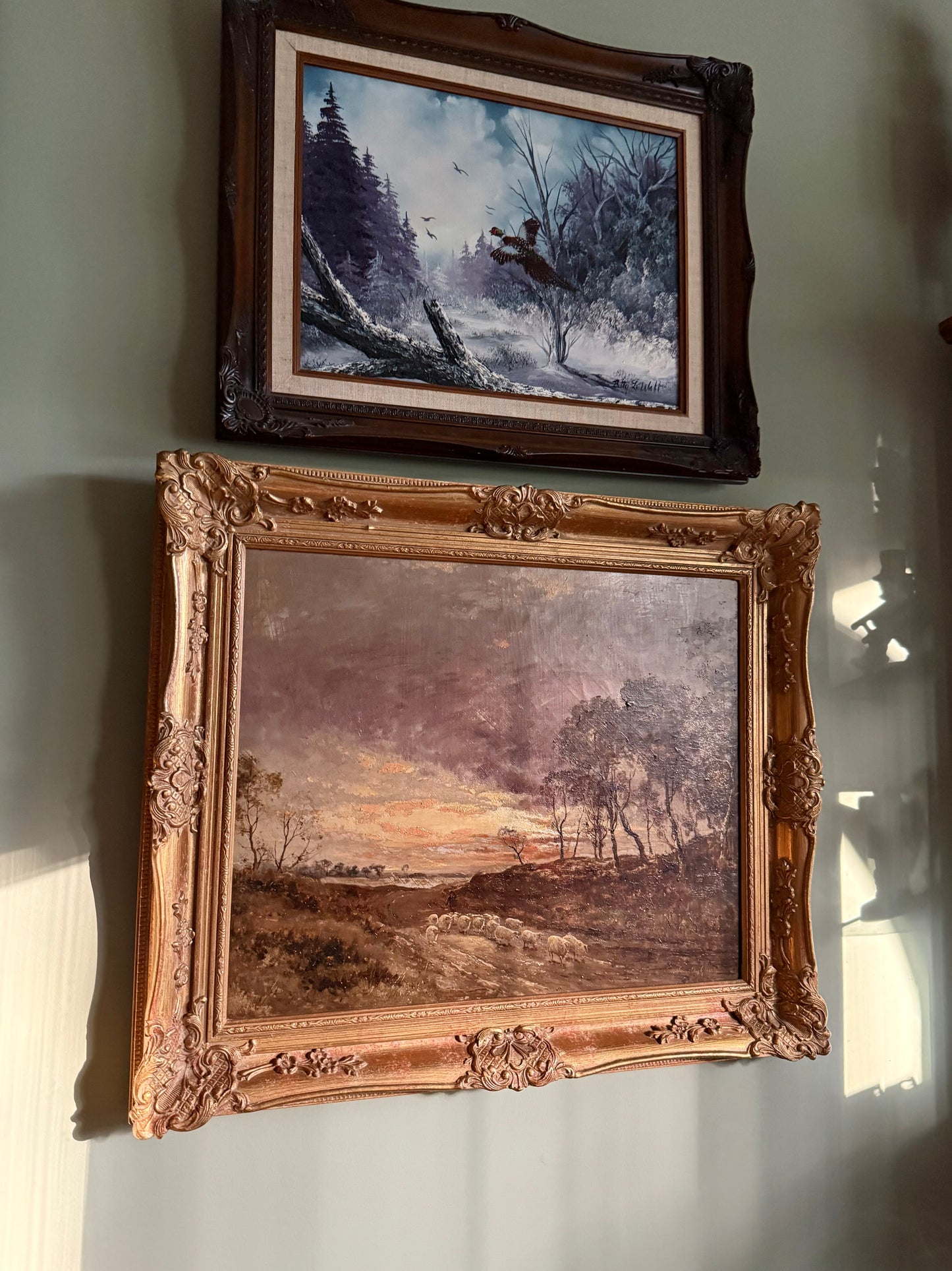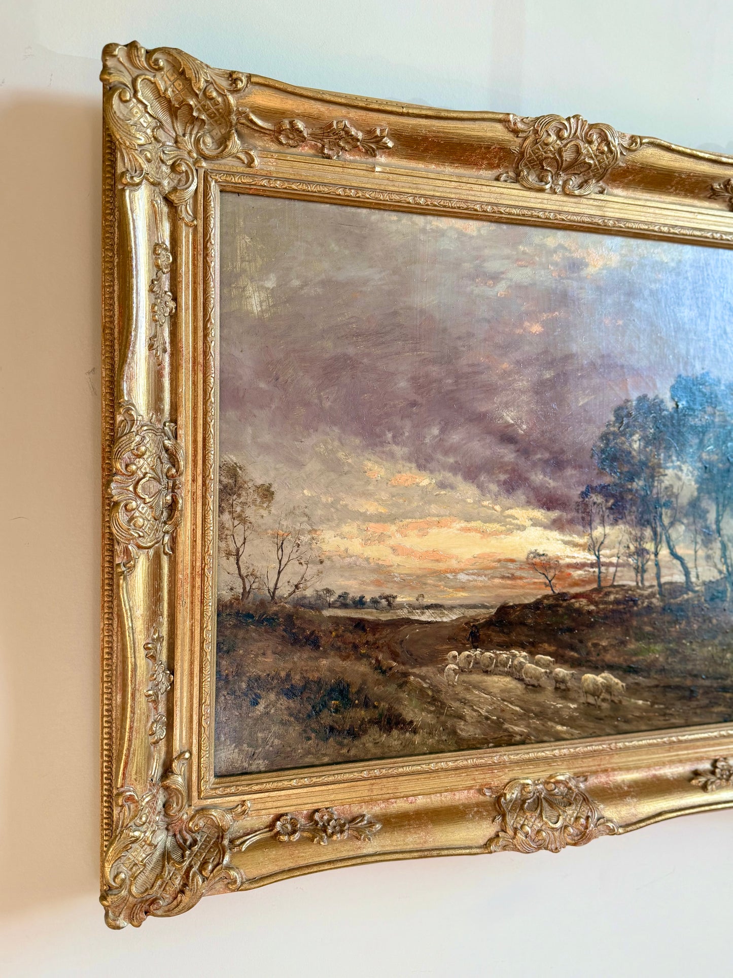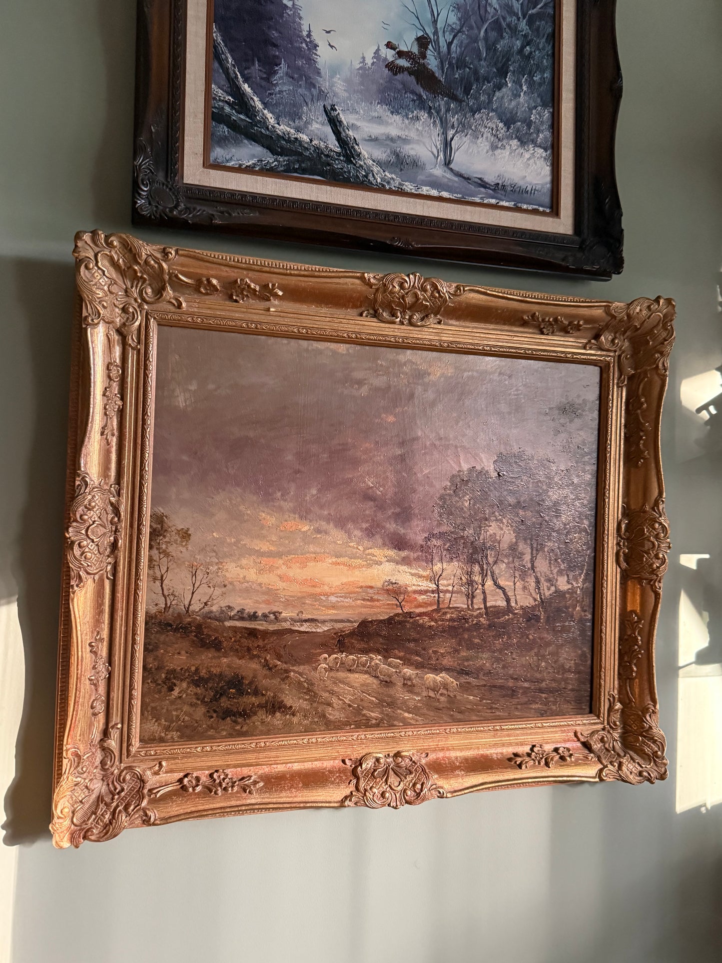 Exhibited at the Royal Academy London between 1840-1859, this beautiful oil painting depicts a landscape with a dramatic sky, as sheep are shepherded across the moorland. This piece is one of our favorites offered at Bonnie Braes. Stunning sunset purple hues across the sky bring warmth to any space; a sentimental nod to Scotland in Your Home.